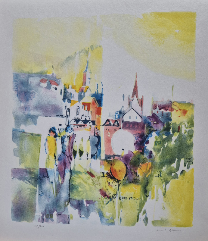 Färgrika målningar, gärna med hus, träd och vatten. Oftast upplevs dem som explosioner med en ljus lätthet i färger och motiv.